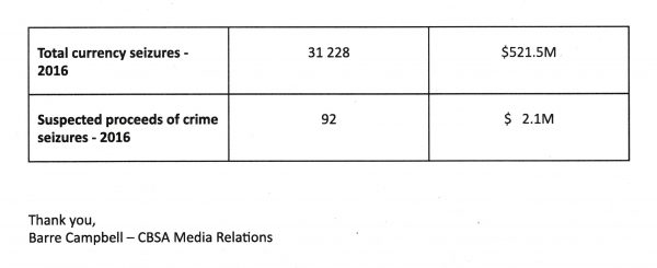 The Canada Border Services Agency last year confiscated more than half a billion dollars from travelers, the equivalent of nearly a third of the Agency’s entire budget. The figure is 100 times greater than seizures claimed in an earlier audit: “It does not mean that funds are the proceeds of crime.”