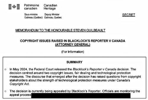 “Discourse that emerged after the decision has raised questions from copyright stakeholders about the strength of technological protection measures under Canada’s Copyright Act,” said the memo. “The decision is currently being appealed by Blacklock’s Reporter. Officials are monitoring the appeal process.”