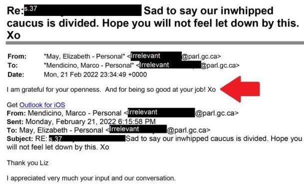 Green Party leader Elizabeth May in a private email to cabinet wrote she was sad a caucus colleague opposed the Emergencies Act. MP May also thanked Public Safety Minister Marco Mendicino for “being so good at your job!”