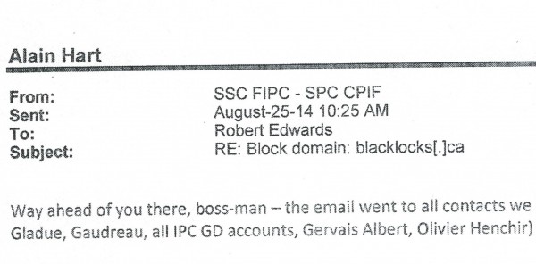 Access To Information records show the department’s IT security division blocked the website blacklocks.ca from last August 22, sending an email alert to numerous agencies including the Department of Industry, Correctional Service of Canada, tax department and others. “The email went to all contacts we have on record,” Dave Tough, a Shared Services security analyst, writes in one August 25 email; “Way ahead of you there, boss-man.”