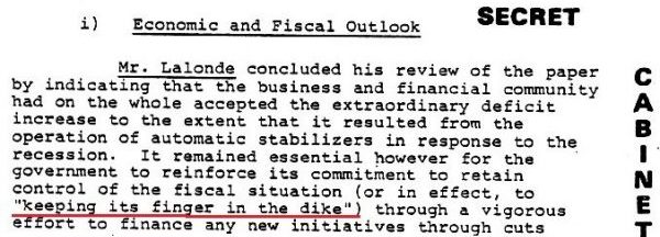 The finance minister at an earlier 1982 meeting described year over year overspending as “extraordinary” and disastrous. “It remained essential however for the government to reinforce its commitment to retain control of the fiscal situation, or in effect to ‘keeping its finger in the dike’ through a vigorous effort to finance any new initiatives through cuts and reallocations,” said Lalonde.