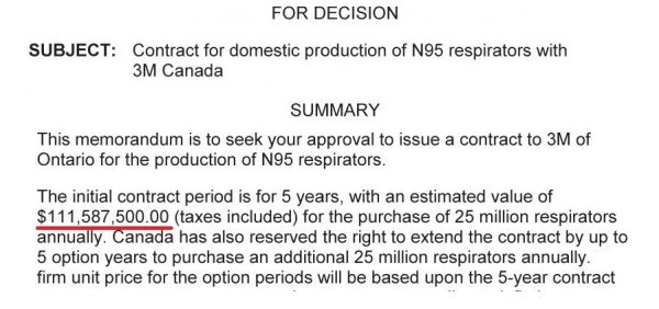 A U.S. conglomerate 3M Company beat out 499 other prospective bidders including Canadian firms to win a lucrative federal contract for high-grade pandemic masks, records show. The contract is worth a minimum $111.6 million and as much as a quarter-billion over ten years: “No issues have been raised.”