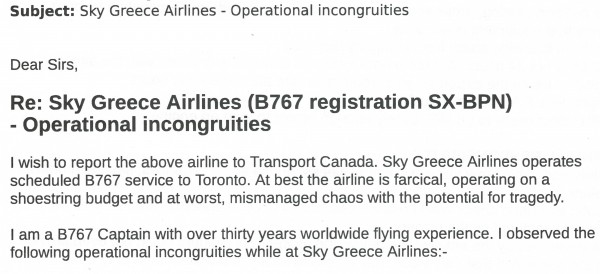 “SkyGreece requires further and more detailed examination by your authority,” wrote the Boeing 747 pilot, who provided his name and contact information. “Please contact me if you require additional information.”