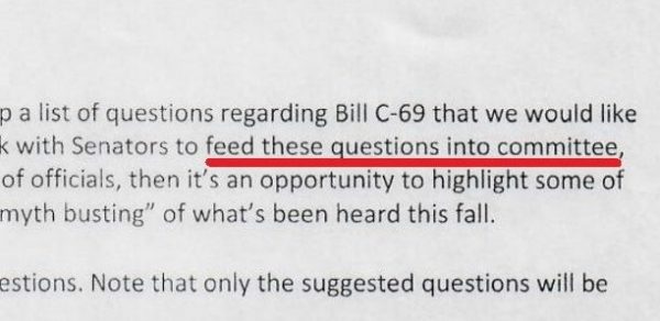 The email detailed 26 ghostwritten questions to be fed to Senators on Bill C-69 including: “Why is this necessary?” “Can you tell me exactly what the benefits would be?” “What is meant by flexibility?” and “What is the government’s plan to address broader concerns?”